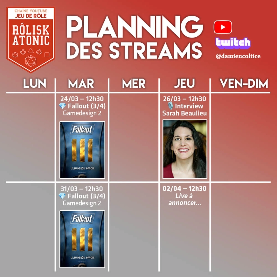 📣 Encore une bien belle semaine sur la Rôliskatonic, sous influence du jeu vidéo avec le suite de notre plongée dans le jeu du mois, Fallout, et l'interview de l'excellente Sarah Beaulieu, autrice, scrip-doctor et narrative designer (entre autres) qui s'est occupé il y a peu à Assassin's Creed Mirage par exemple, et à des choses très intéressantes à dire pour nous les rôlistes !