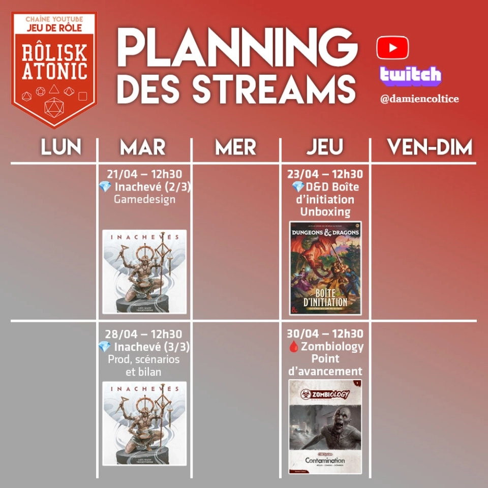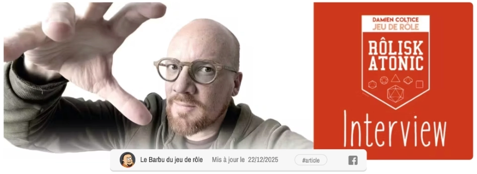 Après 18 ans à travailler dans l'édition de jeux de rôle, je suis désormais indépendant et publie chaque semaine sur la Rôliskatonic des vidéos pour décortiquer des jeux de rôle et partager des connaissances sur la création de jeux de rôle. Et j'écris un jeu de rôle intitulé Zombiology d100 System