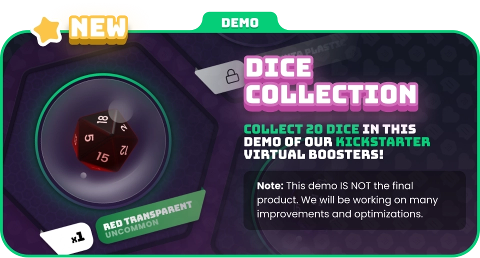 🇫🇷 Surprise !! On vous a préparé un petit cadeau : un mini-jeu pour découvrir la future collection de dés 2026. Chaque jour, vous débloquez 5 boosters à ouvrir… et vous essayez de compléter votre set de 20 dés. Un petit avant-goût de ce qu’on vous réserve pour l’année prochaine.