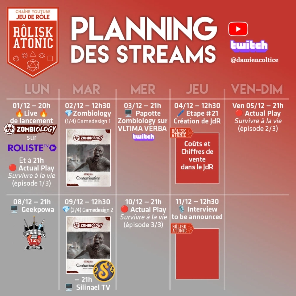 Après 18 ans à travailler dans l'édition de jeux de rôle, je suis désormais indépendant et publie chaque semaine sur la Rôliskatonic des vidéos pour décortiquer des jeux de rôle et partager des connaissances sur la création de jeux de rôle. Et j'écris un jeu de rôle intitulé Zombiology d100 System