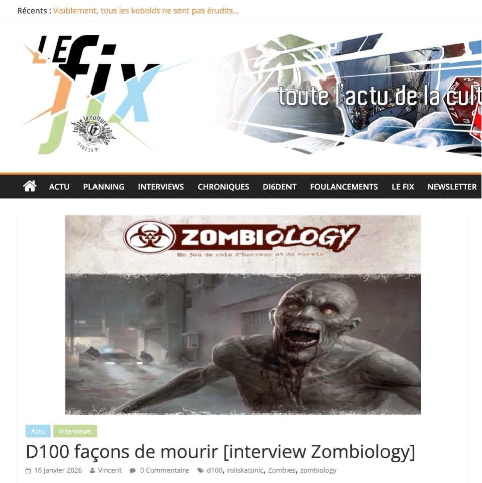Après 18 ans à travailler dans l'édition de jeux de rôle, je suis désormais indépendant et publie chaque semaine sur la Rôliskatonic des vidéos pour décortiquer des jeux de rôle et partager des connaissances sur la création de jeux de rôle. Et j'écris un jeu de rôle intitulé Zombiology d100 System