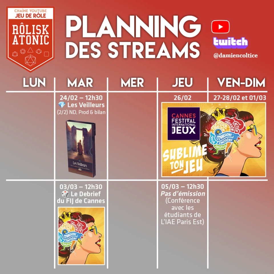 📣 Au programme, les deux prochaines semaines sont bouleversées par le festival International des jeux de Cannes et par une invitation à parler création de jeu de rôle à l'école IAE Paris-Est (un grand merci à Philippe Lépinard pour cette invitation) !