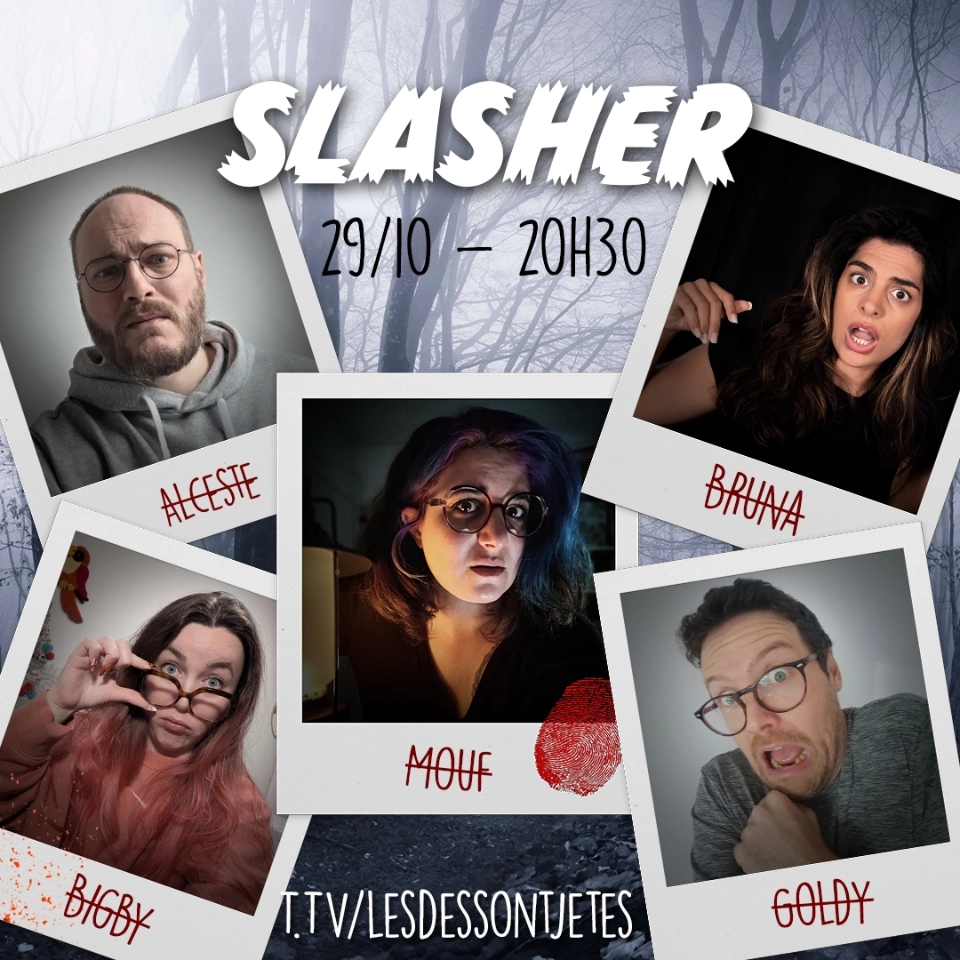 Rendez-vous ce mercredi à 20h30 pour une nouvelle partie de SLASHER avec MonsieurAlceste, Mademoiselle JDR (Bruna), MoufTV , Bigby et Goldy.